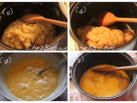 (8) Cho một nửa số trứng vào nồi. Đánh và quậy đều trứng và khối bột.