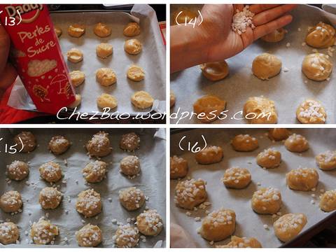 Mình dùng đường hạt có hình như sau ( 13). Đường này có bán tại khu bán đường, bột, đồ làm bánh ngọt trong siêu thị. Nhẹ nhàng rắc đường lên trên các khối bột trên khay ( 14). Lưu ý vì đường dễ rơi ra ngoài nên có thể ấn từng viên đường lên bề mặt bột để đường sẽ ở nguyên trên bánh choux khi ra lò.